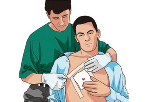 粗针头在伤侧第2肋间锁骨中线处刺人胸膜腔,暂时排气减压。在病人转送时可于针尾部缚一橡胶指套(或气球、避孕套),顶端剪开1厘米的小口。呼气时,气体经剪开的小口排出;吸气时指套塌陷,阻止气体进入,以保证转运途中安全。或胸腔穿刺术,有条件的建议尽快行胸腔闭式引流术。