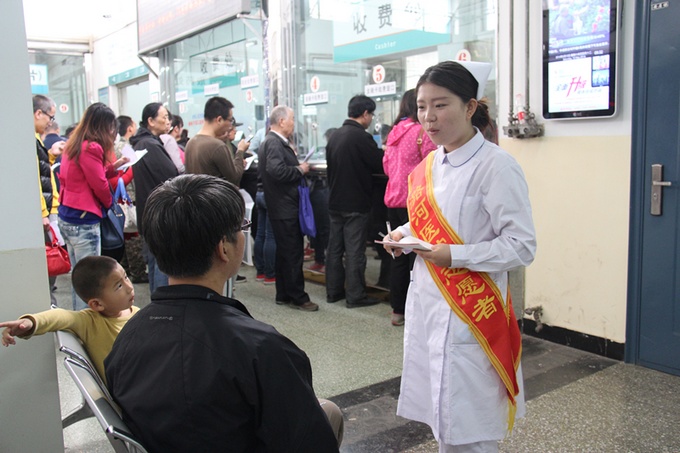 团委与北京护士学校在医院内联合开展志愿者活动,在门诊设立导医咨询点,在患者就诊高峰时期为患者解答疑问、引导患者到相应科室就诊。发放健康宣传材料对患者进行健康宣教,加强医患沟通。在住院楼设立住院患者陪护探视制度宣传员及控烟宣传员,向患者及家属宣传按时探视对住院患者的益处、吸烟对自身及家人的危害、戒烟的方法等内容,努力为住院患者提供良好的就医环境。