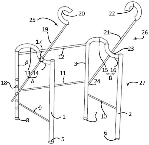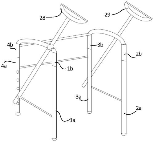 作为优选,所述框架(27)的组件包括第一立柱(1)、第二立柱(2)、第三立柱(3)、第四立柱(4)、第一横梁(9)、第二横梁(10)、第三横梁(11)、第一扶手(A)、第二扶手(B)、第一拐杖(25),第二拐杖(26)