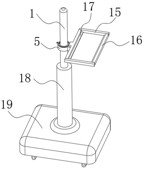 技术功效: [0012]1、本实用新型提供一种便于固定安装的护理用托盘架,通过设置有弹性套环,弹性套环由内接环、压缩簧、弹性密封框、外接环、连接块、控制柄组成,使用时,通过拉动控制柄,控制柄受力拉动连接块,由于连接块安装在内接环上,内接环受力向外拉伸张开,同时挤压压缩簧和弹性密封框,弹性套环套接在安装支柱上,调整好合适角度高度后,松开控制柄,压缩簧和弹性密封框由于自身的弹性作用下,发生弹性形变,使得装置与安装支柱锁紧固定,解决了由于现有的护理用托盘架大多无法对高度和角度进行调节,导致了护理用托盘架无法适用于不同医护人员舒适角度的使用的问题。