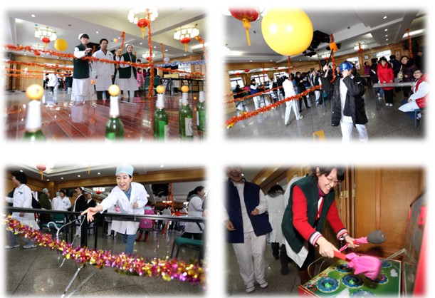 大厅内张灯结彩,装扮一新,呈现出一片和谐喜庆的节日氛围。陆续前来游艺的1400余名职工参加了飞人乔丹、神枪手、芝麻开门、家务能手、打地鼠、浮萍摆可乐、超级导弹等14个趣味横生的游艺项目,并赢取了院工会准备的精美礼品。医院领导也在百忙之中抽出时间来和职工们一起做游戏互动,把游艺活动推向了高潮。