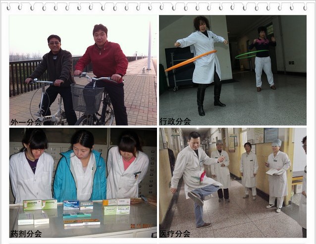 医院工作忙,压力大,体育锻炼机会少,结合这一工作特点,多数分会开展了磨练意志,增强体制的体育比赛活动,打造体育活动“精品”。后勤分会组织职工进行了健康大步走比赛。内一分会、内二分会、妇产分会和财务分会分别组织了跳绳比赛。功能分会、医疗分会分别组织了踢毽比赛。检验分会、行政分会则进行了呼啦圈比赛。外科2个分会在联合组织开展踢毽比赛的基础上,外一分会还组织部分职工在运河森林公园进行了自行车骑行健身活动,外二分会职工在北京市神经外科年会上的舞蹈表演更是尽展潞河医院职工风采。此外,门诊分会针对门诊大厅人流大、问题多的具体情况,结合分会职工的岗位工作特点在门诊大厅进行义务咨询、导医,不仅减轻了门诊服务台的工作压力,同时也得到了患者和家属的好评。为督促职工树立新时尚、展示新形象,使他们在工作之余能够有一份美好的心情和靓丽的身姿,手麻分会举办了一场冬季服装展示活动。职工们穿出自己最亮丽的服装,展示出白衣天使或帅气、或美丽的另一面,创造出手麻分会的美丽“精品”。本次活动最具特色的应数药剂分会,他们创新思维进行了一次全员参与的岗位培训,在由指定药师进行培训和处方点评后,药师们相互交流易出差错、易混药品的特点,相互介绍工作经验。职工们纷纷表示,本次活动对药剂分会职工提高服务质量,保证用药安全将起到很好的推动作用。
