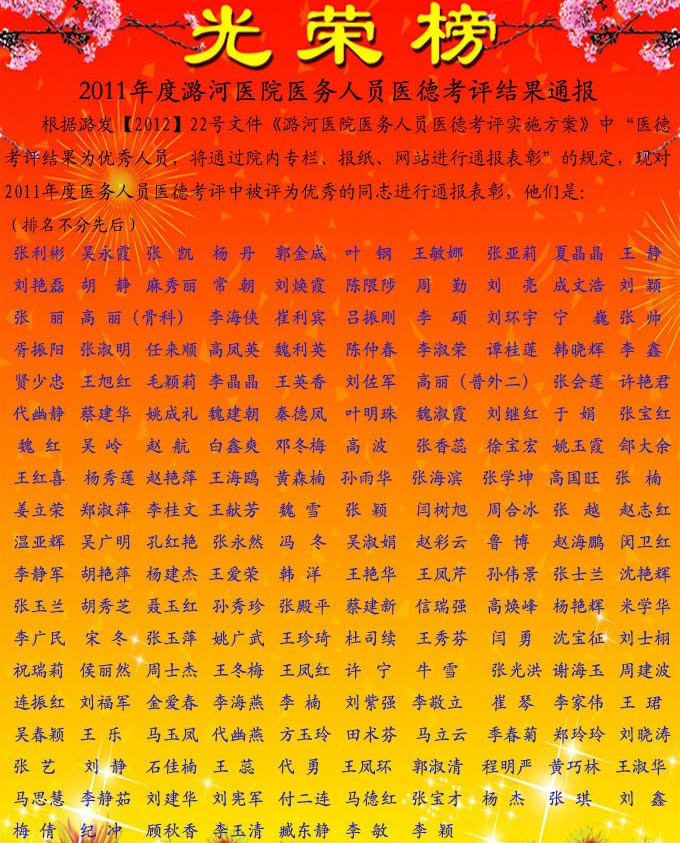 2012年,根据卫生部、市卫生局和通州区卫生局相关文件精神,结合我院实际情况,重新制定下发了《潞河医院医务人员医德考评实施方案》,此方案对考评范围、内容、考评原则及考评结果的应用做了明确的规定。新的考评机制力求既规范医务人员的执业行为,又能有效调动医务人员的积极性和创造性,并且将医德考评工作与医院业务管理相结合,做到相互促进、互为因果。通过科学的考评机制,促进医务人员思想素质、业务素质进一步提高,医院服务环境、服务质量进一步优化,群众满意度进一步提升,借“三级评审”的契机,医院行风建设将会取得更大成效。