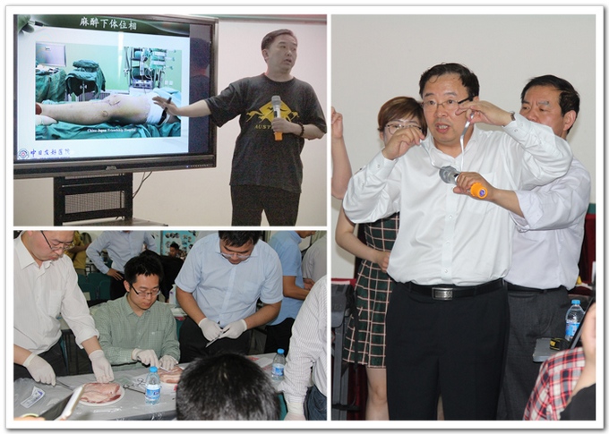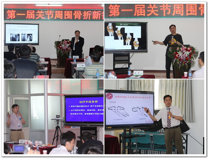 我院骨科主任张亚奎教授进行了简短的开幕致辞。学习班采取幻灯讲课、手术现场直播、模型缝合操作、讨论多种形式结合,内容涉及肩、肘、腕、髋、膝、踝等关节周围骨折的治疗及治疗趋势以及假体周围骨折等。首都医科大学附属北京朝阳医院骨科周君琳教授、北京大学人民医院创伤骨科付中国教授、北京协和医院骨科张保中教授、我院骨科于振山、张亚奎、高家义教授分别以“肱骨近端骨折治疗新技术”、“肱骨近端骨折髓内钉固定学习心得”、“股骨转子间骨折的治疗”、“股骨颈骨折治疗方式的演变”、 “股骨远端骨折新治疗” 、“小儿骨骺损伤”等内容为题进行了精彩的专题讲座并和与会者进行了交流。付中国教授还就“缝线技术在关节损伤中的应用”在会场进行了现场模拟;我院骨科张亚奎教授就“右踝关节骨折切开复位钛板螺钉内固定术”、“右骨粗隆间骨折闭合复位髓内钉内固定术”直播手术示教进行了讲解和交流。
