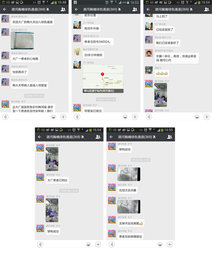 虽然我院也曾救治过从临近通州的河北省地区转诊来的心肌梗死患者,但由于缺乏及时的信息沟通,往往不能做到急救过程的无缝连接。这位患者是第一例通过“潞河胸痛绿色通道”微信群从河北省转诊来的急性心肌梗死患者,实现了无缝连接,绿色畅通,使得患者得到了最及时的救治,也标志着“潞河胸痛绿色通道”走出了通州,走进了河北,这条绿色通道为更多的患者带来了快速便捷的医疗救治服务。