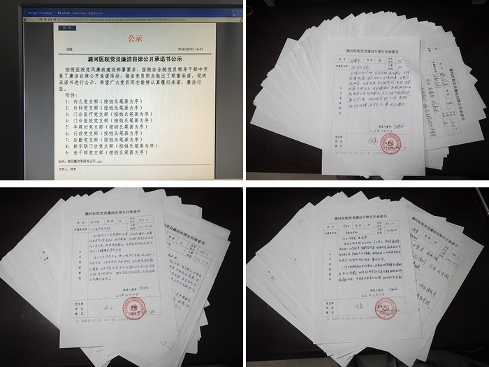 近日,按照区纪委及医院党风廉政建设部署要求,医院在全院党员领导干部中开展了廉洁自律公开承诺活动,每名党员同志结合自己本职工作填写《党员廉洁自律公开承诺书》,做出了郑重承诺,医院将承诺书以支部为单位在医院内网网站上进行公示,相互监督,以此激励广大党员同志发挥共产党党员的先锋模范作用,认真履行承诺,廉洁行医。
