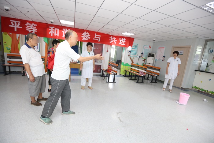 为树立精神患者的自信心,消除自卑感、依赖感,使他们尽快回归社会,融入社会,我院保健科举办了北苑辖区精神患者第一届康复技术大赛。比赛以“平等 和谐 参与 共进”为主题,以运动会为形式,得到了区精防所的大力支持。选手们进行了拍球、踢毽、投沙包、叠衣服等比赛项目,表现出了他们自强不息,乐观向上的精神,也感染着我们在场的每一位裁判员和志愿者,大家情不自禁地为他们拍手鼓掌,呐喊助威,更为他们能像普通人一样生活而欢欣鼓舞。
