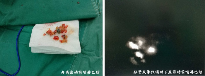 为更好服务广大乳腺癌患者,改善患者的生存质量、减少术后并发症的发生,我院新近购置了明德脉管系统成像仪,并于12月9日成功开展了第一例荧光成像技术辅助前哨淋巴结活检+乳腺单纯切除术,手术由院长纪智礼和乳腺外科主任李明共同完成。术中在乳晕区皮内注射吲哚菁绿,利用荧光成像系统即刻清晰直观地显现了淋巴管引流途径及发光的淋巴结,10分钟内便迅速定位前哨淋巴结的位置。手术成功找寻到5枚前哨淋巴结,在病理科的协助下,确认5枚前哨淋巴结均无肿瘤侵及。该乳腺癌患者幸运地避免了腋窝淋巴结清扫手术,根本上规避了淋巴水肿及功能障碍等并发症的发生。