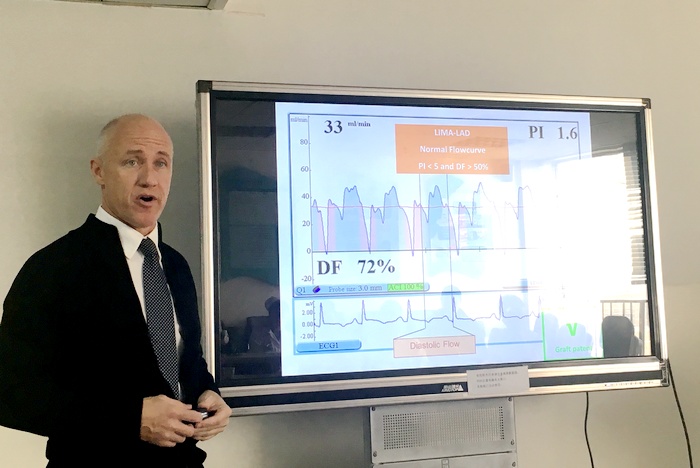 冠状动脉搭桥术的血管远期通畅率好,远期效果远远优于其他方法,对于心外科医生最关心的是血管桥的通畅性,桥血管和吻合口通畅与否是决定心脏搭桥手术效果最主要的因素。3月16日,我院胸心外科有幸邀请到来自瑞士的朱尔斯教授为我们进行了一次冠脉搭桥手术质量评估的重要性的讲座,详细介绍了目前国际同行认可的冠状动脉搭桥手术的利器——血管流量测定仪。血流测量技术是一种简单、易行的判断冠状动脉桥通畅性的方法,血流波形及搏动指数是判断桥通畅的重要指标。血管流量测定仪可即时进行术中冠脉流量测定,定量测试移植血管的血流量。测定仪清晰地显示血流波形并传出奔腾的血流声,使搭桥手术的效果有了量化指标,可发现并矫正桥血管扭曲、痉挛和吻合口狭窄等问题,有效降低桥血管早期失灵、围手术期心梗和血液动力学不稳定的发生。