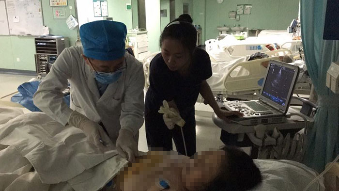 一位是55岁女性患者,在其他医院针灸后出现了胸闷、呼吸困难、大汗情况,来我院急诊查血压为80/65mmHg,胸部CT、心脏超声提示心包积液,急诊收入ICU后经超声引导行心包穿刺置入引流管,共引出血液约300ml,患者症状消失,血压升至正常,心包积液消失后出院。另一位是40岁男性,左前胸刀刺伤后来到我院急诊,胸部CT提示左侧液气胸、心包积液,绿色通道收住院,给予左侧胸腔闭式引流术,复查心脏超声未提示心包积液量增多,但患者心率仍持续增快、大汗、面色苍白,考虑急性心包填塞。急诊开胸探查,发现心包内积血约200ml,心脏左心室前壁1.5cm伤口,给予心脏破裂修补止血后,患者治愈顺利出院。最后一例患者是一位在5年前行左乳癌手术的女性患者,后发现肺转移,入院一周前出现胸闷、喘憋症状,在我院门诊就医后超声提示心包内大量积液,经心包穿刺置入引流管,共引出血液约900ml,考虑为乳腺癌心包转移导致的心包填塞,经治疗无心包积液后拔除引流管出院。
