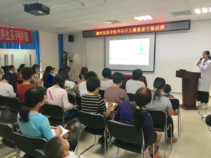 9月24日上午九点,由我院中医中心举办的第一期小儿推拿亲子培训班正式开讲。本期培训班,从前期报名开始就备受关注,由于报名人数太多,场地条件有限,经协调将原定一场的授课增至上、下午两场。培训班由中医中心赵文霞医生授课,课程分为系统介绍小儿生理病理特点、小儿推拿的优势病种、常用穴位及手法、儿童饮食及起居调理健康指导等几部分,并手把手教学员们进行简单的小儿推拿常用保健手法实训操作。各位宝爸宝妈的学习热情非常高,认真做笔记,拍照录像,积极提问。几位小模特也十分配合,每一位学员都基本掌握了小儿保健的常用手法操作。赵文霞医生在授课结束时说:“这次培训班的目的是为了让更多的家长了解小儿推拿,对常见病的防治有一个简单的了解,能自己在家进行一部分保健手法操作,但同时也提醒各位家长学员应该如何对孩子进行一个基础判断,什么样的情况需要由医生及时进行专业处理。希望小朋友们都能健康快乐成长!”