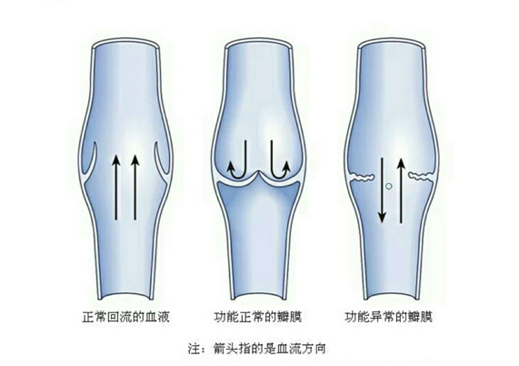 正常情况下,双腿的静脉血液想要回流到心脏,需要克服重力作用,通过小腿肌肉泵、下肢静脉瓣膜和胸腔内负压的作用从下而上回到心脏。小腿肌肉泵又称为“第二心脏”,是一个辅助血泵,可以帮助下肢静脉把血液泵回心脏。另外下肢静脉有许多瓣膜,它们相当于一个单向阀门。当血液回流心脏时,这些瓣膜就开放,反之这些瓣膜则关闭,使血液只能单向行进不致反流。当因为各种原因静脉瓣膜的弹性降低时,不能承受血液的重力就会关闭不严,造成血液倒流、淤积,长期下去就形成了下肢静脉广泛的曲张。血流通过后,因为存在重力等因素,血流会往下返流,而这个时候,静脉瓣膜关闭,就会防止静脉血流的返流,如上图(中)。一旦静脉瓣膜功能受损,造成关闭不全,进而导致静脉血流往下返流,如上图(右)。静脉血流出现返流后,会造成下端静脉管壁变薄,进而出现日常所见的静脉曲张血管团块,也就是青筋暴起。长期站立及长期坐位都是导致下肢静脉曲张的高危险因素。