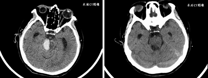 患者刘女士因突发意识障碍于我院神经外科急诊就诊,进行了头颅CT检查提示脑干出血,出血量约为15ml。