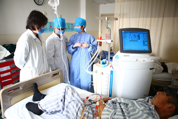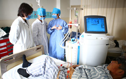 为改善目前传统治疗手段效果不理想的现状,我院肿瘤中心开展了体腔热灌注治疗技术,并成功为一名肺癌晚期患者进行了治疗。该项技术不但填补了区域内的技术空白,同时也成为北京市第一例由肿瘤内科医生开展的体腔热灌注治疗。这位患者是春节后收治于肿瘤科的一位左上肺占位伴左侧胸腔大量积液的老年男性患者,胸水送检后明确为左肺腺癌,伴胸膜转移。老先生胸水增长很快,并有胸痛。在充分评估患者的病情后,肿瘤中心李雪冰副主任医师向患者及家属讲解了热灌注治疗的优点和具体操作过程,征得家属的充分理解和同意。3月6日上午,在超声科医师的协助下,李主任精心操作,程瑜蓉住院医师、王献方护士长密切配合,从麻醉、放置灌注引流管到连接组件、过滤-加热-治疗-过滤,60分钟的治疗过程十分顺利,患者基本无任何不适,胸腔积液得到了有效控制。