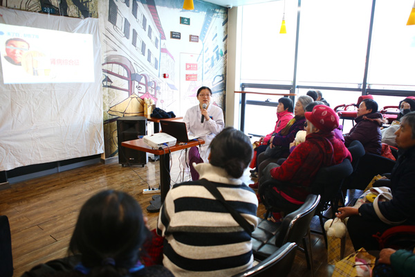 在我院门诊楼二层,香气四溢的咖啡厅里座无虚席,患友们听课的热情高涨。首先,肾病中心袁丹主治医师为大家深入浅出地讲解《女性与泌尿系感染》,形象生动、易于理解,加深了患友们的自我保护意识,防病于未然。《得了糖尿病对肾脏有影响吗?》不少肾友们都有这样的担心,接下来史亚男主治医师就为大家解答了心中的疑惑。其实,糖尿病的患者是肾脏病的高危人群,一定要定期进行监测。《高血压跟肾病有什么关系呢?》看到了这个题目,不少老年女性心里犯起了嘀咕,她们有的自己患有高血压,有的是老伴儿患有高血压,高血压的肾脏损害也是她们最担心的问题。李妍主治医师为她们进行了相关知识的介绍,听完李妍医生的讲解,大家觉得特别有帮助。有一位阿姨不停地说:“今天真的学到了很多有用的知识,这个活动真好!什么时候还有啊?我还想参加!”讲座完毕,患友们热情未减,又陆续围绕到了义诊医生的桌前。没几分钟,肾病中心主任李忠心、主任刘永泉、医生李妍、刘小菁、刘聪慧的桌前已经排起了候诊的队伍。各位医生耐心解答、详细讲解,为患友们答疑解惑。护士长马思慧带领护士姐妹们全力协作,发放资料、测量血压、健康宣教……平时“一号难求”的各位专家走出诊室,主动来到患者身边,解决的是患者一个个急切的问题,拉近的是彼此的心……
