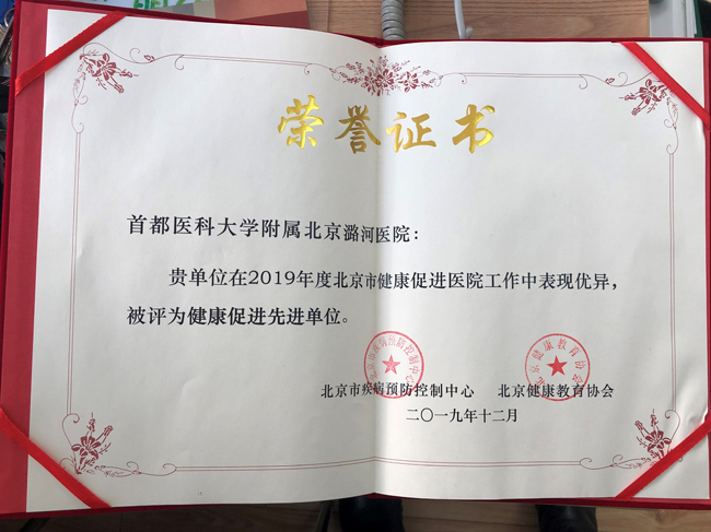 近日,北京市疾控中心健康教育所根据2019年度全市健康促进医院工作的实施情况进行表彰,我院荣获2019年度北京市健康促进医院“先进单位”称号。