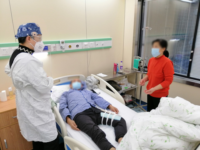 创伤骨科王雪飞主任得知此事后,第一时间率领骨中心住院总医师赴血液科进行会诊。在仔细了解病情后,王雪飞主任提出两种治疗方案,一种是保守治疗,需要打夹板,卧床静养;另一种是内固定手术治疗。考虑到患者较年轻(男性,51岁),保守治疗需要卧床时间长,护理难度大,并发症发生几率高等原因,经讨论及沟通后,王雪飞主任果断决定,采取手术治疗方案。