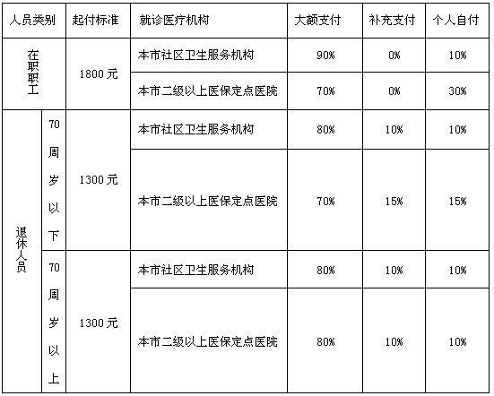 答:北京市参保人员门诊大额互助资金支付及个人自付比例见下表: