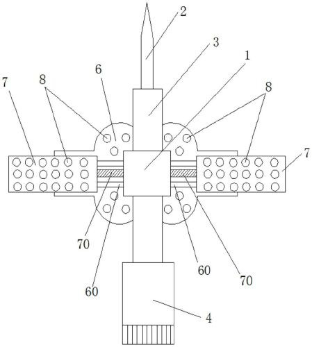 优选的,所述固定勾块和蝶翼部上间隔设置有贯通的透气孔。