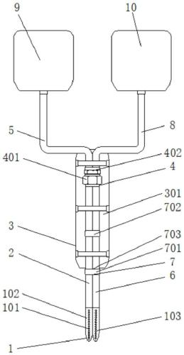 为实现上述目的,本实用新型提供如下技术方案:一种可卸装式腹膜透析导管,包括扩流机构、锁紧机构和透析液带,所述扩流机构的上方分别连接有第一导管和第二第一导管,且第二第一导管位于第一导管的一侧,所述锁紧机构的后端安装有腰带机构,且锁紧机构位于第一导管的上方,所述第一导管的中部安装有限位机构,所述锁紧机构的上方分别连接有第一连接管和第二连接管,且第二连接管位于第一连接管的一侧,所述第二连接管的上方连接有空袋,所述透析液带位于第一连接管的上方。