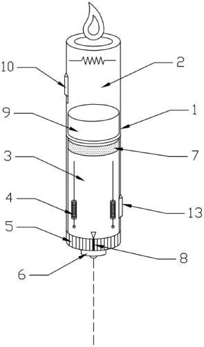 作为改进,所述打火器主体上部开口处内设有火花装置,所述柱形壳体壳体上设有打火开关,所述火花装置电性串联打火开关和电源,所述打火器主体内还包括燃烧气罐,所述燃烧气罐的开口端通过打火开关控制连接,所述打火器主体上设置有用于充气的插孔,类似打火机的原理,实现便携式打火的目的,燃烧气罐内可以是酒精汽、汽油汽等便于燃烧同时便于安全压缩的燃烧气。