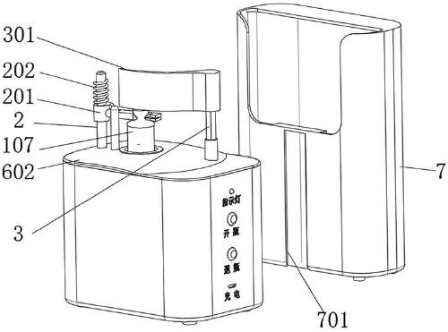一种安剖瓶自动开瓶器,是由安剖瓶三爪夹紧机构、旋转夹头、锁紧齿、锁紧电机、导电滑环组、支撑柱、减速电机、金刚石刀片固定杆、金刚石刀片组、扭力弹簧、安剖瓶掰断臂轴杆、安剖瓶掰断臂、掰断臂减速电机、锂电池、电路控制板、主机外壳、防滑减震垫脚、机盖、废瓶回收盒组成的。该开瓶器可实现安剖瓶瓶自动夹紧固定,自动将安剖瓶瓶头掰断,开瓶快速,开瓶后会有提示音,该开瓶器防止开瓶人员扎伤手指,开瓶过程中脱离双手操作,提高工作效率。该废瓶回收盒与主机连接拆卸方便,便于清除瓶头废弃物、方便消毒。