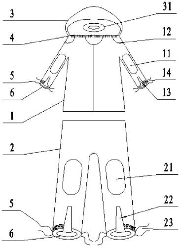 进一步地,为了更好地实现本实用新型,还包括约束带,所述开口式袖口的开口两侧以及所述开口式裤脚的开口两侧均连接有一根所述约束带。