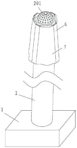具体来说,所述冷冻机内存放有冷冻液,所述冷冻液通过所述输送管进入所述喷头,并从所述喷头上的所述喷孔进入所述冷冻囊袋内,进入所述冷冻囊袋后的所述冷冻液转化为气体,使所述冷冻囊袋充气膨胀,而所述喷孔多个均布设置,使得对所述冷冻囊袋内充气的过程中,所述冷冻囊袋受力更加均匀,充气也更加均匀,所述冷冻囊袋充气膨胀后,形成表面均匀的球状结构。