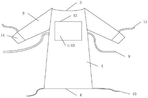 2、本实用新型提供的多功能病号服设有第一约束带和第二约束带,第一约束带固定病员位置,确保病员的安全,第二约束带固定病号服底摆位置,保护病员的隐私。