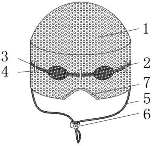 与现有技术相比,本实用新型的有益效果是:本实用新型结构简单、设计新颖,通过头罩戴在新生儿头部,通过眼罩主体和头部紧缩绳可以有效的调节两个眼罩主体之间的距离,从而适应不同瞳距的新生儿,提高适用范围,此外通过头部紧缩绳、颌下紧缩绳以及固定件可以调节头部紧缩绳、颌下紧缩绳的有效长度,从而更加牢固的贴合在新生儿头部,避免其滑落,且由于头部紧缩绳、颌下紧缩绳为棉质构件,且内部无弹性纤维,可以有效地防止其造成新生儿勒痕,不会造成血流不畅的情况发生,有利于新生儿治疗。