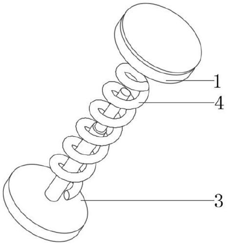 所述调节件包括:装配为一体的第一直杆和第二直杆、以及套设在第一直杆和第二直杆外侧的压缩弹簧,第一直杆固定连接于枕块的下端中部,第二直杆固定连接于底块的上端中部,且第二直杆为中空状其内具有上下贯通的空槽,所述第一直杆的自上而下地插入空槽内,且第一直杆可在空槽内上下滑动。