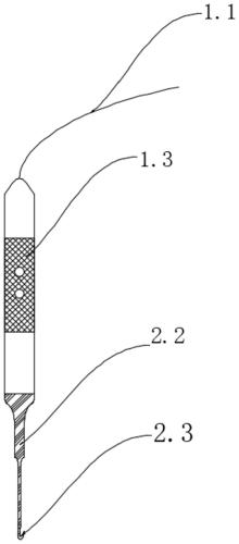 所述静脉剥脱钩组件包括静脉剥脱钩本体、第二连接部、第二电极弹性接触片、绝缘部以及钩体;所述第二连接部设置于所述静脉剥脱钩本体顶端,所述第二连接部一端插入至所述空腔内,以实现所述第二连接部与所述第一连接部连接;所述第二电极弹性接触片设置于所述第二连接部外侧;所述钩体设置于所述静脉剥脱钩本体底端;所述绝缘部设置于所述第二电极弹性接触片与所述钩体之间。