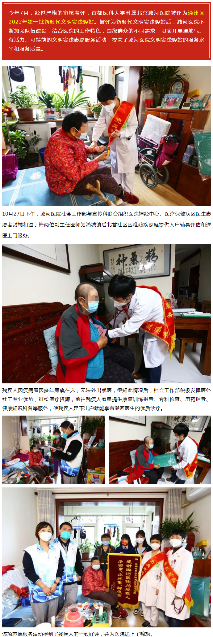 轻轨:八通线通州北苑站、九棵树站下车乘坐公交车潞河医院站下车即到