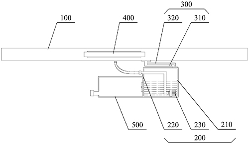 技术功效: [0025]本实用新型提供的一种肛周皮肤冲洗装置,包括支撑板和出水机构;支撑板上设置有开口,开口在患者平躺状态下正对肛周;出水机构设置于支撑板的下方,并且具有出液口,出液口的出液方向朝向开口。 [0026]由于患者平躺状态下肛周正对开口,且出水机构出液口的出液方向朝向开口,出液口输出的液体可对患者的肛周皮肤进行冲洗,不再需要护理人员使用毛巾对患者肛周皮肤进行繁琐的擦拭,也不用对危重患者的躺卧体位进行较大幅度的调整,方便对危重患者的肛周皮肤进行冲洗清洁。