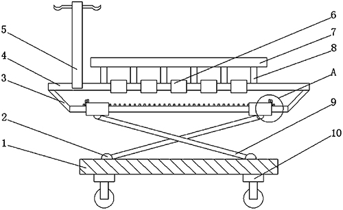技术功效: [0014]与现有技术相比,该种心内科临床抢救装置具备如下有益效果:该心内科临床抢救装置,通过将病人放在承重布上方,第二支撑杆受力下降,第二支撑杆受力下降带动斜杆,斜杆带动第一支撑杆下降,第一支撑杆下降移动使两个套管相互远离,实现将第二支撑杆下降,两个弹簧通过第二销轴两个支架下降,通过挡板卡在齿牙之间对套管进行限位,通过万向轮进行移动,实现将重心降低增加稳定性,避免出现晃动,导致对病人造成二次伤害,将输液架向后推动,带动连接杆向后移动,连接杆向后移动带动卡块向后移动,卡块向后移动从通孔内部脱离,转动输液架将输液架放平松开,通过弹簧将连接杆推出,卡块卡入通孔内部,实现将输液架进行折叠,避免出现输液架卡顿,导致病人无法直接放入救护车的现象发生。