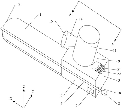 技术功效: [0021]1、本实用新型提供的多功能压舌板的灯光块与顶面转动连接,灯光块的转动带动LED灯的照射区域改变,能够满足口腔内任意区域的强光照射需求。 [0022]2、本实用新型提供的多功能压舌板的聚光罩与套体螺纹连接,调节聚光罩与套体啮合的长度从而改变凸透镜与LED灯之间的距离,调整照射区域的大小。当LED灯与凸透镜之间的距离大于凸透镜的二倍焦距时,LED灯发出的光线汇聚成的照射区域小,亮度高;当LED灯与凸透镜之间的距离大于凸透镜的一倍焦距且小于凸透镜的二倍焦距时,LED灯发出的光线汇聚成的照射区域大,亮度较低。 [0023]3、本实用新型提供的多功能压舌板设有吸管,吸管能够将口腔内阻碍观察的口水或痰液吸走,操作简单,方便观察口腔内组织情况。 [0024]4、本实用新型提供的多功能压舌板的聚光罩为中空圆台,既能够起到保护LED灯的作用,又能够增大聚光罩的面积,便于对LED灯产生的热量进行散热,还有利于减小LED灯的光线衰减。 [0025]当然,实施本实用新型的任一产品必不特定需要同时达到以上所述的所有技术效果。 [0026]通过以下参照附图对本实用新型的示例性实施例的详细描述,本实用新型的其它特征及其优点将会变得清楚。