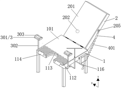 技术功效: [0017]一方面,通过压力感应器、音乐播放器和控制器之间电连接,当妇科患者躺在第一垫体时,触发压力感应器并通过控制器控制音乐播放器播放音乐,音乐可以转移患者的注意力,帮助妇科患者缓解检查的不适; [0018]另一方面,可以将医务人员所需的检查物品置于支撑组件的支撑板上,便于医务人员及时取用医用检查物品,无需将上述检查物品专门放置于治疗车或者随手放置于其它平台上,从而节约时间成本,进而缩减患者的检查时间以及提高医务人员的工作效率。 [0019]当然,实施本实用新型的任一产品必不特定需要同时达到以上所述的所有技术效果。 [0020]通过以下参照附图对本实用新型的示例性实施例的详细描述,本实用新型的其它特征及其优点将会变得清楚。