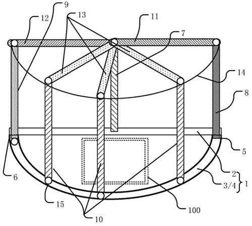 技术功效: [0022]本申请中设置了下轨道、固定支柱、第一支柱、第二支柱和第三支柱,下轨道具有弧形的滑道,第一支撑片连接了固定柱和第一支柱,第二支撑片连接了固定柱和第二支柱,第三支撑片连接了固定柱和第三支柱,而固定柱是固定在第一部上的,在使用时,将第二支柱和第三支柱在滑道内滑动,当第二支柱由第一端滑动到第二端时帘布完全展开,方便使用。 [0023]本申请中的第一支撑片、第二支撑片和第三支撑片可以选用金属材料,更坚固,不易损坏。 [0024]当然,实施本实用新型的任一产品必不特定需要同时达到以上所述的所有技术效果。 [0025]通过以下参照附图对本实用新型的示例性实施例的详细描述,本实用新型的其它特征及其优点将会变得清楚。