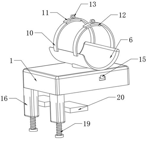 技术功效: [0012]该血液透析用手臂固定支架通过设置安装块,利用安装块内开设的空腔,再利用空腔内设置的压缩弹簧,同时利用压缩弹簧上设置的移动杆,使得移动杆能够受压在空腔内向下移动,压缩弹簧弹力向上移动,利用移动杆上设置的支撑块,使得支撑块能够对患者的手臂进行支撑,利用空腔内设置的第一齿环,再利用移动杆上设置的第二齿环,同时利用第一齿环和第二齿环之间的卡合,能够通过转动移动杆来调节支撑块的角度,以及当支撑块受压时能够带动第二齿环和第一齿环卡合,此时能够防止移动杆转动,以能够将支撑块固定在任意角度,增加患者的舒适度,使患者的手臂能够足够放松,避免对血液透析造成影响; [0013]该血液透析用手臂固定支架通过设置固定块,利用固定块上开设的滑槽,再利用滑槽内滑动设置的滑块,然后利用固定块上螺纹连接的螺栓,同时利用螺栓与滑块之间的转动连接,进而能够通过转动螺栓来带动滑块在滑槽内滑动,利用滑块上设置的挤压板,从而使得滑块的滑动能够带动挤压板与安装块相对移动或相反移动,便于对该支架的固定和拆卸。