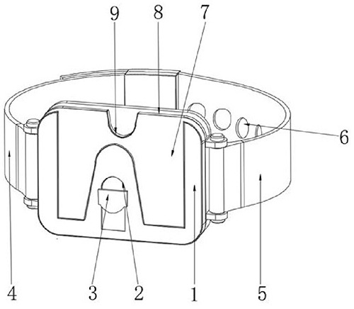 技术功效: [0011]本实用新型具有灵活的佩戴使用性,能够便于不同的患者佩戴使用,进而提高其灵活适应性,且在使用过程中,通过信息插槽与清单插槽的配套组合,能够对患者的基本信息及药物清单进行核对,同时在过敏指示标识的指示提示下,对患者的病情信息进行多方位的标记处理,进而提高医疗人员对患者病情的了解情况。
