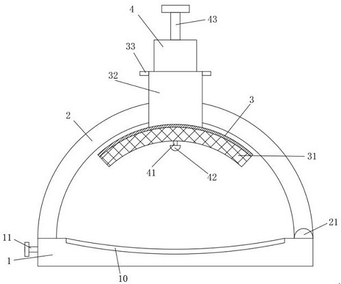 技术功效: [0012]利用底托能够有效的将手臂进行支撑,定位环的设计,能够有效的使消毒棉层和喷头固定在手臂用于穿刺点的上方,喷头的设计的,利用活塞板的向下运动,能够使消毒液通过喷头直接喷出,直接进行喷淋消毒,可以将喷头采用孔径很细的喷头,这样消毒液喷涂的更加的均匀,利用率更高,提高消毒效果;固定板和消毒棉层的设计,当穿刺完成后,通过固定板的向下运动,即可实现消毒棉层的按压,代替了人工长时间的按压,十分的方便。
