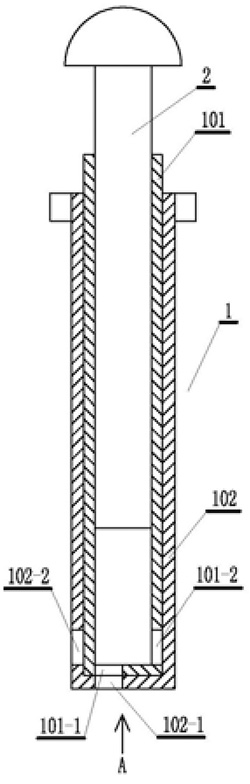 技术功效: [0012]本实用新型的有益效果是:通过对注入器注入管的改进,将注入管由两层相套的管道组成,两层相套的管道从两个方向不同位置开口,两层套管做相对转动,就可以实现用一个骨水泥注入器就可以至少在两个方向分别或同时进行骨水泥的注入。 [0013]下面结合附图和实施例对本实用新型进行详细描述。