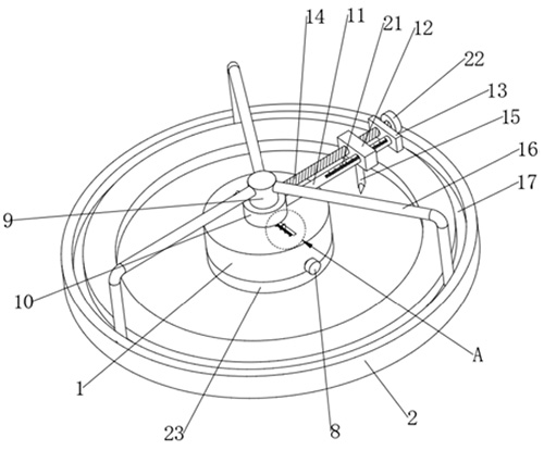 技术功效: [0015]1.通过转动第一旋钮可以带动双向螺纹杆转动,双向螺纹杆转动可以使得两个第一滑块之间间距发生变化,从而可以对两个打孔头之间的间距进行调节,通过转动丝杆可以带动第二滑块滑动,第二滑块滑动可以使得刀针随之一起运动,从而调节刀针距离连接柱轴线的位置,进而可以使得该装置可以不同尺寸的鼻塞固定软胶进行裁剪,适用性强,在使用时,将软胶放置在支撑台上,按压上基座,打孔头可实现软胶中部的打孔,然后向下按压导向杆使得刀针贯穿软胶,刀针贯穿软胶之后,拨动导向杆使得导向杆绕着连接柱的轴线转动,从而可以使得刀针对软胶的外围进行切割,相较于人工裁剪,使用该装置裁剪,大大提高了裁剪效率。