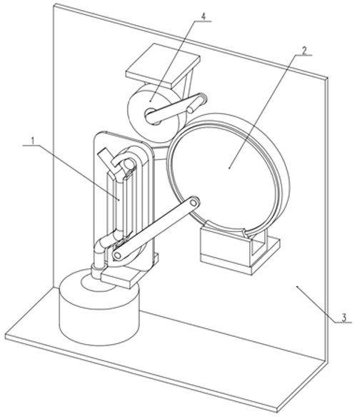 技术功效: [0008]采用上述结构本实用新型取得的有益效果如下:本方案一种新型儿科呼吸道清理驱动装置,通过挤压杆一和挤压杆二的循环挤压能够使软质导管中形成负压,从而将儿童呼吸道中的积痰或者积液吸入集液瓶中,通过挤压传动装置能够控制挤压杆一和挤压杆二的循环转动,手摇驱动装置能够通过手摇的方式驱动挤压传动装置,磁性中间挡板通过和磁性限位滑槽之间的排斥磁力平衡掉磁性中间挡板的自身重力,从而保持磁性中间挡板悬浮固定,由于挤压杆一和挤压杆二始终处于磁性中间挡板的两侧,配合磁性中间挡板和磁性限位滑槽之间的磁性的稳定作用,使磁性中间挡板保持在原有位置,不会发生大幅度的摆动,弹性挡片为软质弹性材质,通过自身形变为挤压杆一和挤压杆二的移动进行导向,通过圆形转盘在弧形轨道中滑动,从而模拟自传的效果。