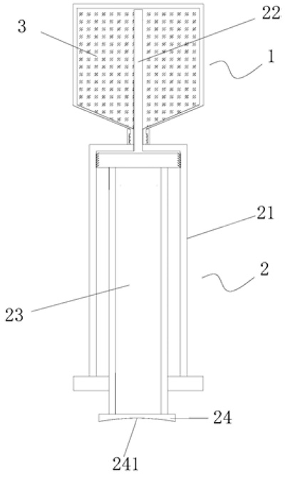 技术功效: [0022]本实用新型提供的直肠给药装置,包括储药器和注射组件。通过设置注射导管伸入储药器的内部,使用时,拉动活塞柄,在活塞的作用下,将储药器的内部预设药物由储药器经过注射导管进入至中空的套筒内,由于设置第一连接结构与第二连接结构可拆卸连接,当药物全部或者满足使用需求的足够药物进入至套筒内后,通过第一连接结构与第二连接结构的配合,将储药器拆除。拆除储药器后,通过推动活塞柄,在活塞的作用下经过注射导管直肠给药,设置注射导管的长度设置为不小于3cm,在实际的生产和使用过程中,注射导管的长度可根据不同使用人群设置,临床使用时,可根据不同的使用需求制作成多种规格,根据不同的使用条件选用对应规格的注射组件。 [0023]通过采用此直肠给药装置,由于采用注射组件,储药器的内部预设药物可全部进入套筒,再通过套筒经过注射导管将药物送入肠管,药液可通过直肠粘膜的迅速吸收进入大循环,发挥药效,避免目前的直肠给药装置不能全部挤出,注药不畅、使用不便的问题。