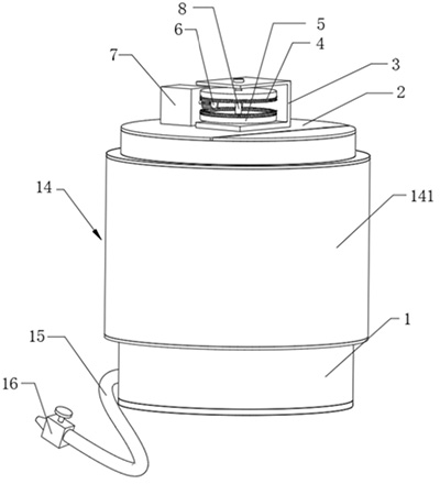 技术功效: [0019]1.通过采用上述技术方案,通过电机可以带动正齿轮转动,进而带动其上下两侧的独一齿轮和第二端面齿轮往相反的方向转动,第一端面齿轮转动时可以带动与其固定连接的转轴转动进而可以带动其两侧的第二杆件在流食瓶内搅拌,第二端面齿轮转动时可以带动与其固定连接的空心轴转动进而可以带动其两侧的第一杆件在流食瓶内转动,由于第一端面齿轮和第二端面齿轮的转动方向相反,所以第二杆件和第一杆件在流食瓶内的搅拌方向也相反,这样可以使流食瓶内的食物长时间处于均匀状态,避免了设备中食物由于离析导致部分体积较大的食物沉积在设备底部,进一步避免了沉积的食物堵塞该设备的出食口。 [0020]2.通过采用上述技术方案,通过在第一杆件和第二杆件端部设置与流食瓶壁贴合的刮板,可以在转轴和空心轴转动时,将粘附在流食瓶内壁上的食物及时挂下去,避免了该设备在使用由于无法及时刮除内壁上的食物,而导致内壁上结垢影响设备使用的问题,进一步提高了该设备的实用性。