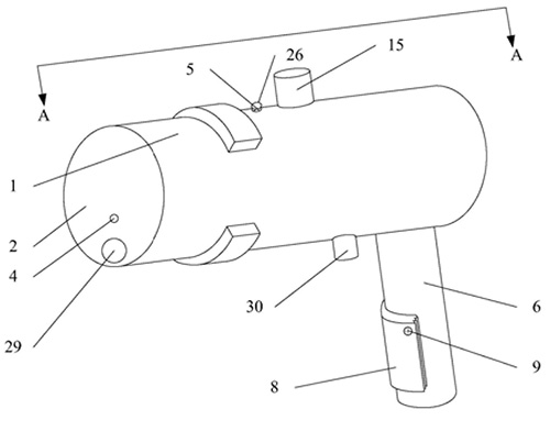 摘要: 本实用新型公开了一种用于呼吸内科护理的口腔给药装置,包括:壳体包括设有第一通孔的第一端面,壳体的侧壁设有第二通孔;内设空腔的气体增压结构连接壳体,气体增压结构的侧壁设有连通空腔的气囊;第一管道设置于壳体内,第一管道远离第一端面一端为封闭端面;第二管道一端连通第一管道的侧壁,另一端连通空腔;第三管道一端连通第一管道的侧壁,另一端连通壳体;单向充气结构包括槽体、隔断板和第一弹簧;挡板设置于第一端面与第一管道之间;拉线贯穿第二通孔,一端连接挡板远离气体增压结构一侧,另一端与位于壳体外的拉环连接。通过向第一管道内放置药品,拉动拉环时,药品能够随着气体一同喷出,实现上药位置的精准控制,结构简单成本低。