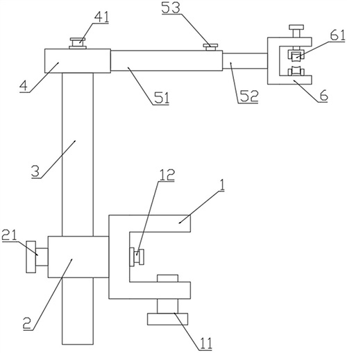 技术功效: [0017]固定框的设计,使底板能够通过固定框固定在床沿一侧,而固定框的可转动,使固定框,能通过不同的情况,调节固定框的旋转角度,使固定框能够更好的与不同的床沿进行固定,调节杆在底板上的可上下运动,能够根据不同的需求,调节输送器的高度,从而满足不同的输送高度需求,调节盘的可转动,使输送器在高度进行调节固定后,能够通过调节盘的转动,使输送器,能够更好的调节角度,延伸杆的可伸缩,使输送器能够根据不同的需求,进行调节不同的位置,使输送器,能够精准的到达指定位置;上述相结合使用,能够根据不同的情况,调节输送器的输送高度,输送角度和输送位置,实现多维空间的调节,能够使底板与床沿固定后,输送器能够更好的运动至需要的位置,并且进行固定;