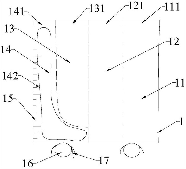 技术功效语段: [0016]该种分隔式医用垃圾桶,与传统的垃圾桶相比,相同的是,均包括桶本体,与传统的垃圾桶相比,不同的是,本实用新型的桶本体被分隔为生活垃圾空间、厨余垃圾空间、痰液空间和痰纸空间,生活垃圾空间用于存放生活垃圾,厨余垃圾空间用于存放厨余垃圾,痰液空间用于存放痰液,痰纸空间则用于存放痰纸,实现了垃圾的分类存放,同时生活垃圾空间、厨余垃圾空间、痰液空间和痰纸空间均设有独立的盖体,通过盖体实现各个空间的密封,尤其是痰液空间和痰纸空间的盖体,避免了痰液暴露于空气中,降低了通过痰液传播疾病的风险。 [0017]另外,本实用新型的痰液空间和痰纸空间相邻,并且痰液空间上设有刻度线,刻度线的设置便于观察患者痰液颜色、性质和量,对于临床诊断有一定意义。