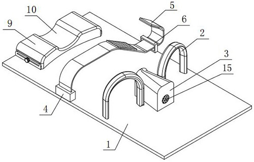 技术功效语段: [0021]本实用新型提供的体位固定器主要由底板、头部支撑座、两个腿部限位套、生殖器保护壳以及腹部固定组件组成,可防止睡着患者的双腿相互靠近而挤压生殖器上的切口,同时可有效防止在睡着以后患者不自主地进行翻身而导致生殖器上的切口被碰到而影响愈合速度。